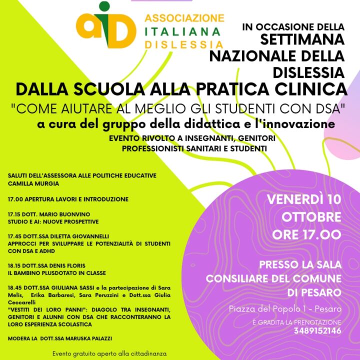 In occasione della settimana nazionale ed europea della dislessia ti invitiamo ufficialmente all’evento “DALLA SCUOLA ALLA PRATICA CLINICA, COME AIUTARE AL MEGLIO GLI ALUNNI CON DSA, organizzato dal gruppo della didattica e l’innovazione della...