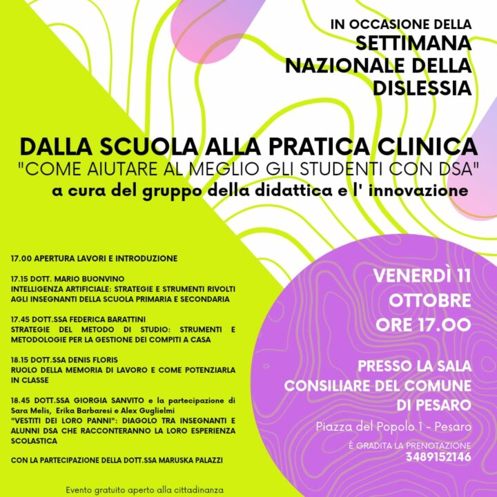 Anche quest’anno per la settimana della Dislessia noi ci siamo, con un Convegno incentrato sulla pratica e l’innovazione! PARTOCINIO AID Venerdì 11 ottobre 2024 nell’aula magna del Comune di Pesaro, in Piazza del Popolo...